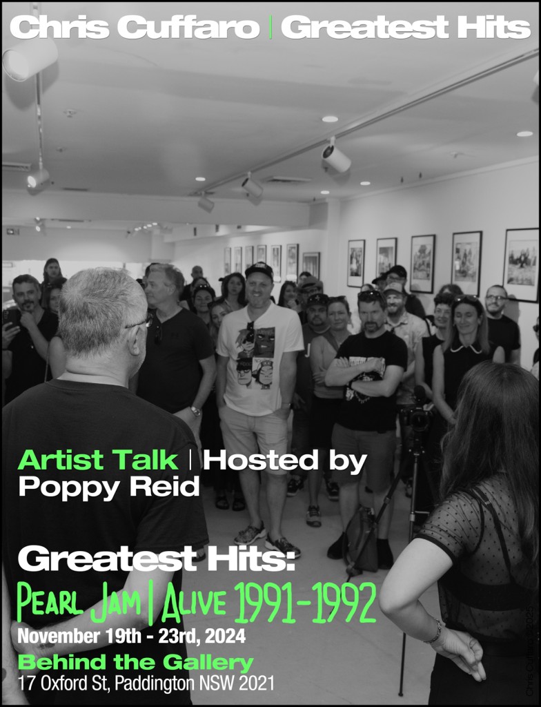 On November 23, 2024, I hosted my Artist Talk in Sydney, Australia for the Pearl Jam – Alive 1991–1992 exhibition at Behind the Gallery. A great crowd of Pearl Jam fans showed up to hear the stories behind the photos—and just as memorable were the stories they shared about the band.